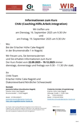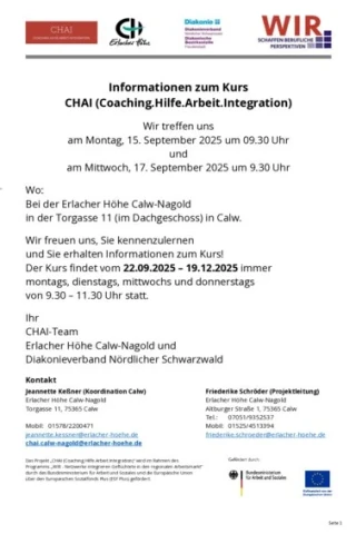 Die aktuellen Kurse im Projekt CHAI finden in Calw und Nagold statt, die nächsten Kurse starten ab 01.2026 in Calw und Nagold.