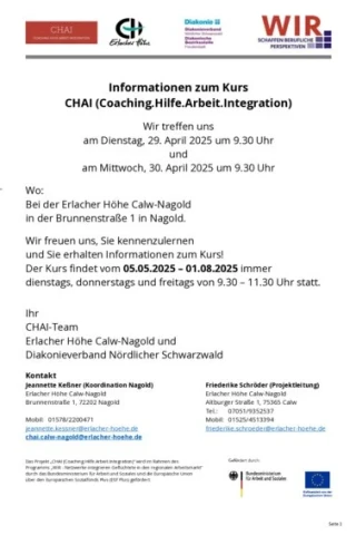 Die aktuellen Kurse im Projekt CHAI finden in Calw und in Nagold statt, die nächsten Kurse starten ab 01.2026 in Calw und in Nagold.