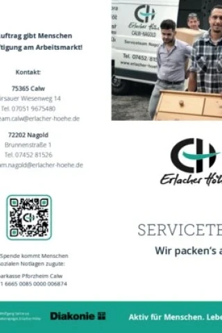 In unserem Serviceteam Nagold haben Beschäftigte die Möglichkeit, sich ganz praktisch wieder ins Arbeitsleben einzufinden und längerfristig im Arbeitsleben zu stehen. Sie erhalten qualifizierte Anleitung und Unterstützung durch Arbeitsanleiter und Jobcoaching zur Klärung der beruflichen Zukunft, Stellensuche und Bewerbungsvorbereitung. Wir bieten tagesstrukturierende Maßnahmen sowie elf Arbeitsplätze und derzeit weitere acht sozialversicherungspflichtige Arbeitsplätze an, teilweise gefördert durch das Jobcenter Landkreis Calw.